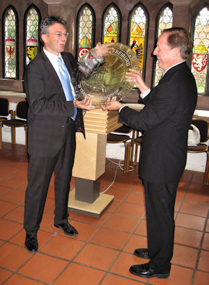 Watching the official ceremony together with representatives from other cities that were founded more than 900 years ago by the Dukes of Zähringen Right: Mayor Salomon receives Madison's gift a glass plate commemorating 20 years of partnership between the cities of Madison and Freiburg. |