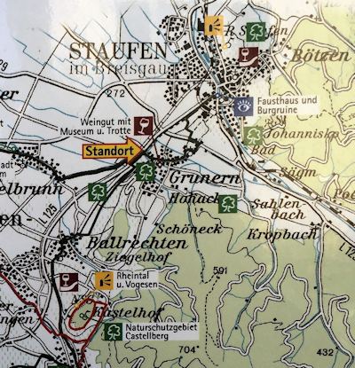 From there we start our hiking tour to Grunern with a little drink at the Bären-Bad (Standort) and pass through the vineyards in the direction of Castellberg. On our way back we shall stop for a bite at the Probst-Strauße Schleifsteinhof above Grunern around 1 p.m. We return to Staufen and, as the case may be, we climb up to the castle. The return to Freiburg is scheduled for 3.30 p.m.