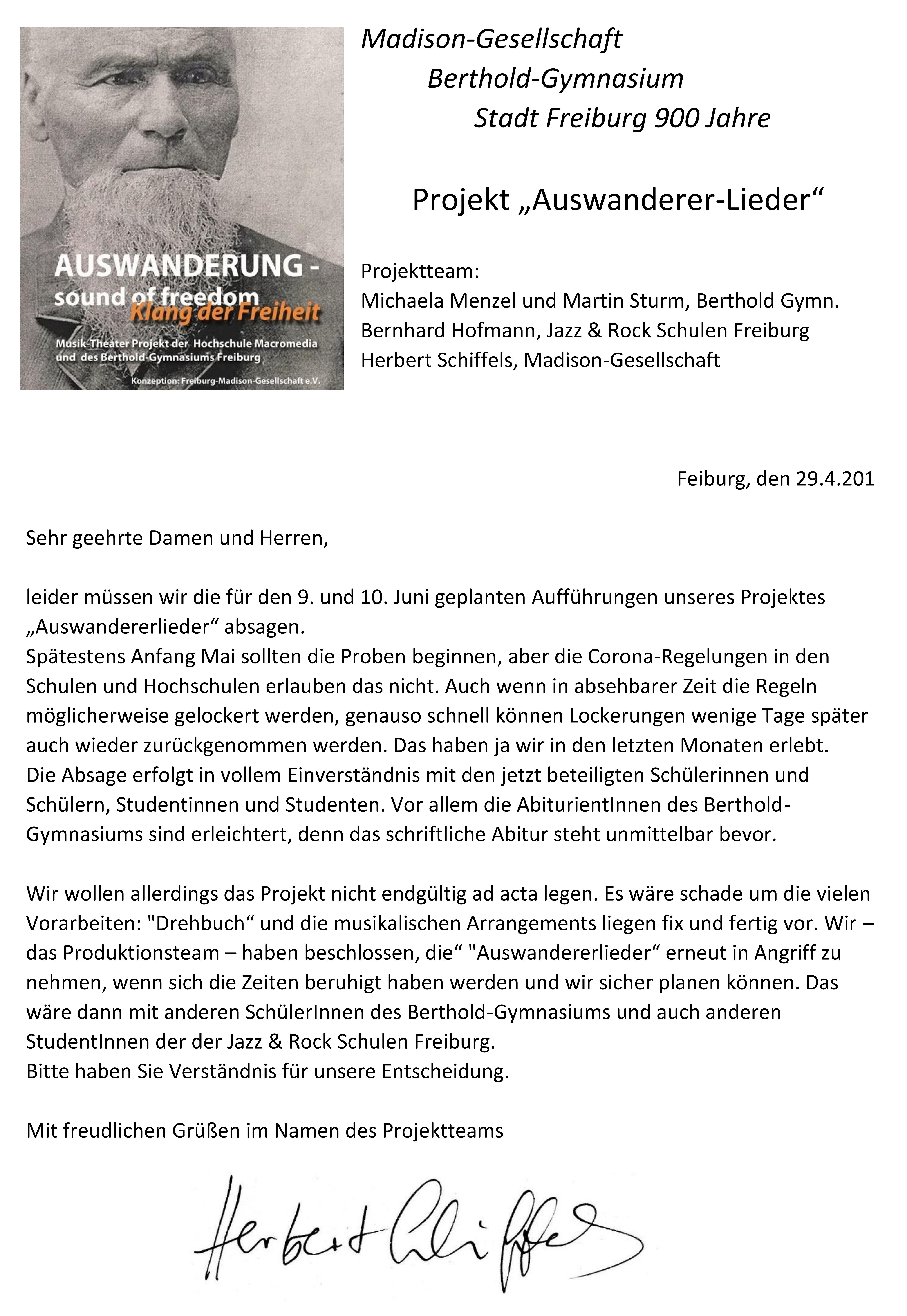 Im Zentrum für Populäre Kultur und Musik der Universität lagern viele Texte von Auswanderer-Liedern, doch ohne Melodien! Studentinnen und Studenten der Musikhochschule und der Hochschule Macromedia (Jazz&Rock) haben elf dieser Texte vertont und für verschiedene Besetzungen arrangiert. Schülerinnen und Schüler des Seminarkurses Geschichte am Berthold-Gymnasium haben dazu die Geschichte aufgearbeitet.