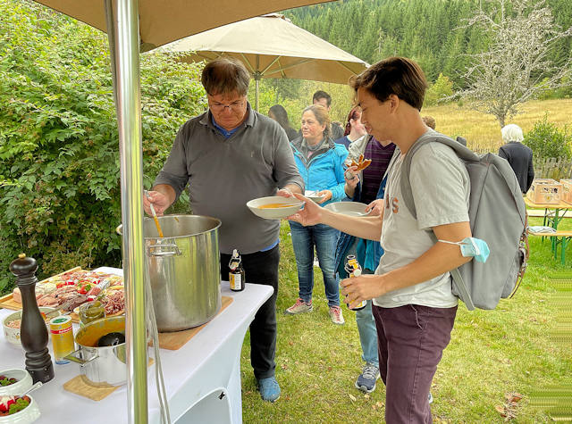 AYF Program Director and Studenten mit Flammkuchen.