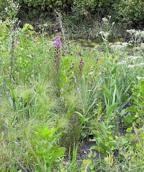 Schwarze Plastikabdeckungen drängen den starken, den Wasserdurchlauf reduzierenden Bewuchs zurück.