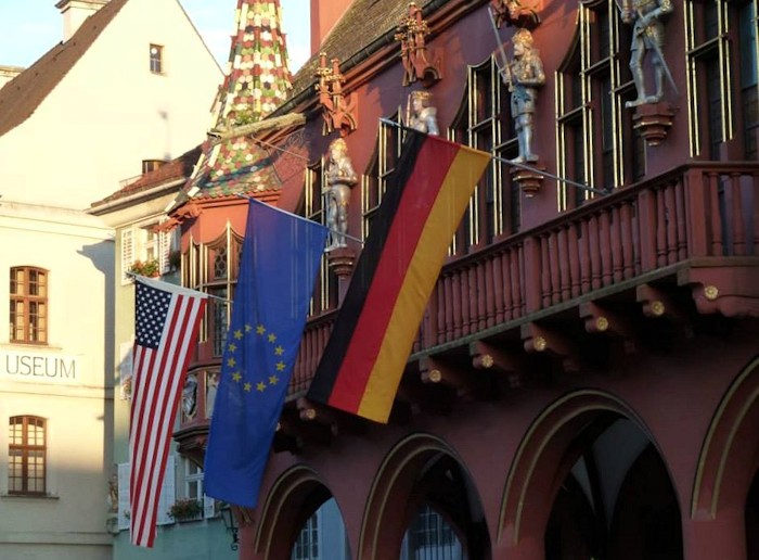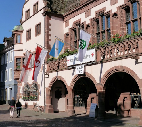 Rathaus (new townhall) around 8 a. m. on June 7, the flags of Freiburg,
