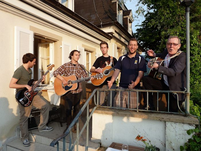 The four guitars in the evening sun are from left to right: the AYFs Dan