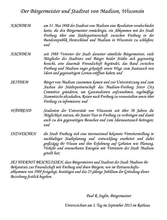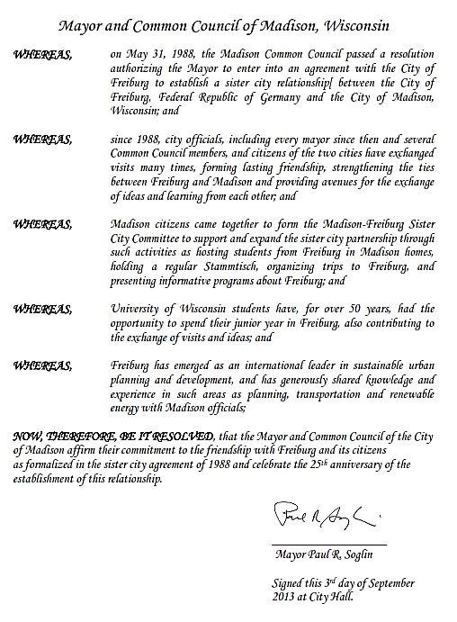 From September 3 to 5, an official delegation of the City of Freiburg headed by Mayor Dr. Dieter Salomon returned the visit Mayor Paul Soglin had made to Freiburg at the beginning of June, celebrating the 25th anniversary of the sister city partnership between our cities. Freiburg's delegation visiting Madison comprised the Mayor for Social Affairs Ulrich von Kirchbach and seven municipal councilors of various parties. Five members of the Freiburg-Madison-Gesellschaft (Freiburg's Sister City Committee, abbreviated FMG) traveled to Madison too. They were invited to participate in a program that the City of Madison and the Madison-Freiburg Sister City Committee had generously prepared. The following picture gallery only poorly reflects the hospitality of the people of Madison and the impressive program arranged for us.