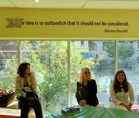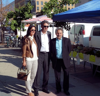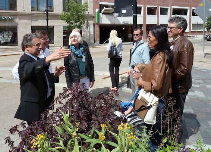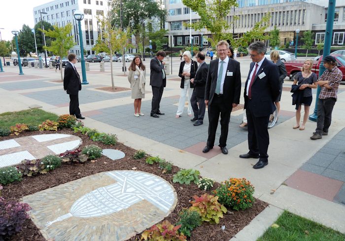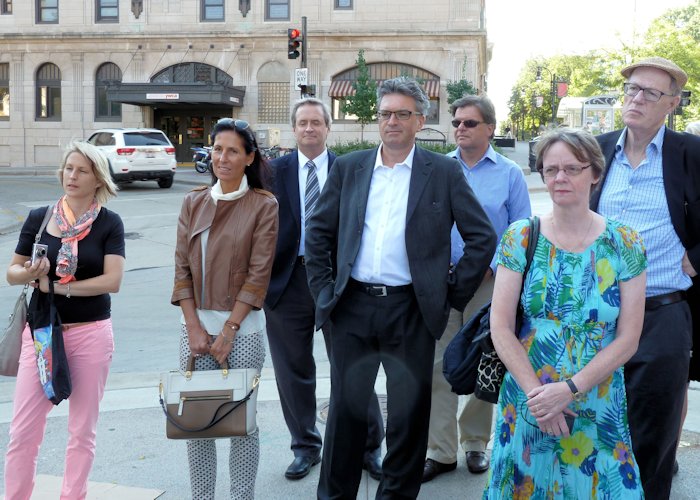 Mayor Paul Soglin welcomed his visitors at the hotel and took his time taking us for a walk down State Street. Mayor Dr. Dieter Salomon, his Chief of Staff Helga Mayer, and Municipal Councilor Anke Dallmann on the right as well as the President of the Freiburg Madison Gesellschaft (FMG) Toni Schlegel and Vice-President Frauke Feix, left, attentively listen to Mayor Soglin's explanations. In the back green energy counselor Ted Petith is watching the scene.