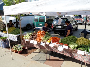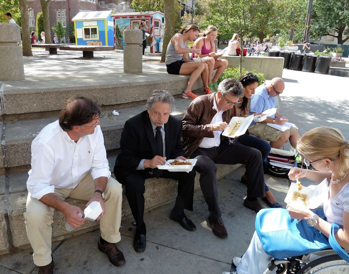 Following the walk in the sunshine, the group had lunch at the food carts down State Street. Toni talks with Mayor Soglin while Mayor Salomon and the ladies dig into their food. Two of those famous food carts are seen in the back.