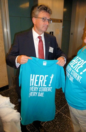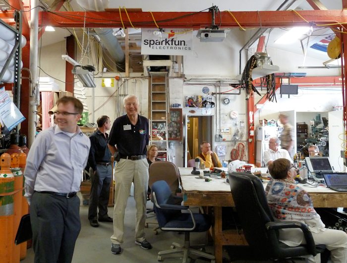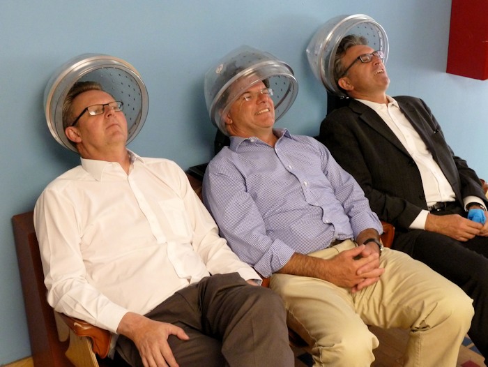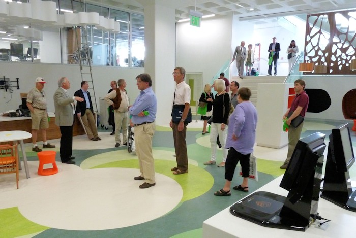 Waiting for access while the freshly washed floor in the Children's Museum dried up. To the left is Freiburg's international relations expert Petra Heß, and to the right stands Municipal Councilor Michael Moos. In the back to the left of Toni Schlegel smiles Steve Cover, Head of Madison City Planning.